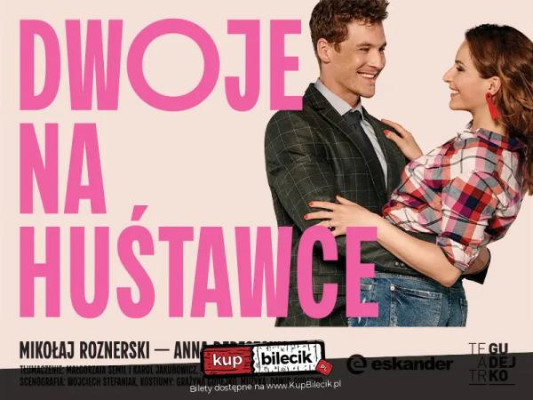 Słodko-gorzka komedia romantyczna o parze młodych, zagubionych ludzi. Co ich połączy? Romantyczna, zabawna i przejmująca historia dwójki nieznajomych. Trafiają na siebie w przełomowych momentach swojego życia. Ona - tancerka, on - prawnik. Oboje zmagają się z silnymi emocjami, sprzecznymi marzeniami i pragnieniami . Ich życia przypominają huśtawkę rozbujaną pomiędzy skrajnościami. Czy coś ich połączy? W dwie skrajnie różne osobowości w spektaklu "Dwoje na huśtawce" wcielają się Anna Dereszowska i Mikołaj Roznerski. To opowieść o tęsknocie, miłości i poszukiwaniach własnej ścieżki wśród życiowych dylematów. Pełnej wzruszeń historii cały czas towarzyszy dobry humor.